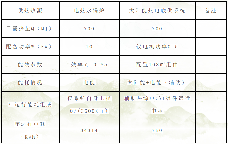 按108平方米布置熱電聯(lián)供組件共42塊,相較于傳統(tǒng)電鍋爐供熱每年將節(jié)約7.19萬(wàn)KWh電量。